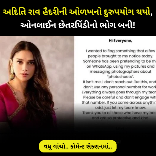 હું કામ માટે કોઈ વ્યક્તિગત નંબરનો ઉપયોગ કરતી નથી. બધું હંમેશા મારી ટીમ દ્વારા જ થાય છે. તેણીએ ઉમેર્યું, “કૃપા કરીને સાવચેત રહો અને તે નંબર પર સંપર્ક કરશો નહીં. જો તમને કંઈ વિચિત્ર લાગે, તો મારી ટીમને જણાવો. મને ટેકો આપનારા અને આટલા રક્ષણાત્મક અને દયાળુ બનનારા દરેકનો આભાર.” તેણીની પોસ્ટમાં, અદિતિએ એક વોટ્સએપ મેસેજનો સ્ક્રીનશોટ શેર કર્યો છે જેમાં એક નંબર અને તેનો ફોટો નોટ સાથે જોડાયેલ છે. જોકે, અભિનેત્રીએ તેને નકલી ગણાવ્યું છે.