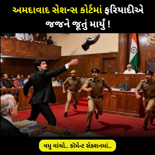 જેમાં કોર્ટમાં જજ પર જૂતું ફેંકવામાં આવે નમસ્કાર આપની સાથે હું છું પાયલ અમદાવાદની સેશન કોર્ટમાં જજ પર જૂતું ફેંકવાની ઘટના આજે બપોરે સામે આવી ફરિયાદીએ કોર્ટરૂમમાં જજ પર જૂતું ફેંક્યું પોલીસે જજ પર જૂતું ફેંકાતા જોયું અને એ શખસની અટકાયત કરી પણ હવે શું થશે એની સાથે મોટો પ્રશ્ન છે એડિશનલ પ્રિન્સિપલ જજ જે હતા એમપી પુરોહિત એમના પર જૂથું ફેંકવામાં આવ્યું ફરિયાદીની અપીલ એમને નકારી કાઢી અને પછી ના પાડી તો એ વ્યક્તિને ગુસ્સો આવી ગયો અને પછી એને ગુસ્સામાં અને ગુસ્સામાં પગમાંથી જૂતું કાઢીને ફેંકી દીધું. આખી ઘટનાની વાત કરીએતો અમદાવાદની સેશન કોર્ટમાં ફરિયાદીની અપીલ પર સુનવણી ચાલી રહી હતી. એડી પ્રિન્સિપલ જજ એમપી પુરોહિત અપીલ કાઢી નાખતા ફરિયાદે ફરિયાદી જે હતા