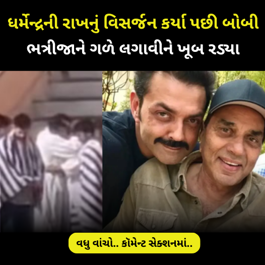 ધર્મેન્દ્રના મૃત્યુ પછીથી બેભાન રહેલા બોબી દેઓલ, પિતાના વિસર્જન દરમિયાન બાળકની જેમ ભાંગી પડ્યા. તેમણે તેમના ભત્રીજાને ગળે લગાવીને ખૂબ રડ્યા, અને તેમનો ભાઈ સની તેમની મદદ માટે દોડી ગયો. સનીએ તેમના નાના ભાઈને ટેકો આપ્યો. બધા જાણે છે કે આખો દેઓલ પરિવાર હાલમાં ખૂબ જ મુશ્કેલ સમયમાંથી પસાર થઈ રહ્યો છે.