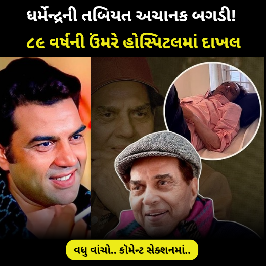 બોલીવૂડમાંથી એક એવી ખબર સામે આવી છે જેને સાંભળી લાખો ચાહકોની ધડકન વધી ગઈ છે। હિન્દી સિનેમાના હી-મેન કહેવાતા ધર્મેન્દ્ર હોસ્પિટલમાં દાખલ થયા છે હા, 89 વર્ષની ઉંમરે પણ દર્શકોના દિલ પર રાજ કરનારા ધર્મેન્દ્ર હાલમાં મુંબઈના બીચ કૅન્ડી હોસ્પિટલમાં દાખલ છે.માહિતી મુજબ તેઓ રુટિન ચેકઅપ માટે હોસ્પિટલમાં દાખલ થયા છે, પરંતુ આ સમાચાર સોશિયલ મીડિયા પર ફેલતા જ ચાહકોમાં ચિંતા ફેલાઈ ગઈ છે.છેલ્લા કેટલાક મહિનાઓમાં બોલીવૂડએ પંકજ ધીર, ગોવર્ધન અસ્રાની અને સતીશ શાહ જેવા દિગ્ગજ કલાકારોને ગુમાવ્યા છે