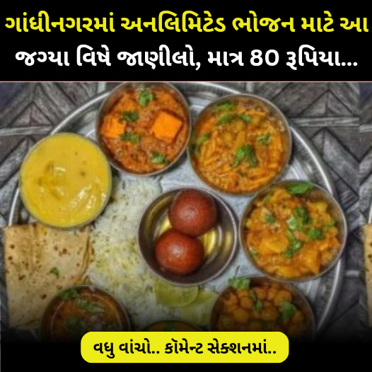 ગાંધીનગર ફરવા જતા હોય તો અનલિમિટેડ ભોજન માટે આ જગ્યા વિષે જરૂરથી જાણીલો, માત્ર 80 રૂપિયા…જેમાં માત્ર ૮૦ રૂપિયામાં ગુજરાતી પાંચ શાક, મીઠી, તીખી બે દાળ, ભાત અને રોટલી તેમજ સલાડ અનલિમિટેડ મળે છે આ સિવાય એકવાર છાસ પણ મળે છે અને જો તમે એક્સ્ટ્રા છાસ પીવા ઈચ્છો તો માત્ર ૧૦ રૂપિયામાં લઈ શકો છો