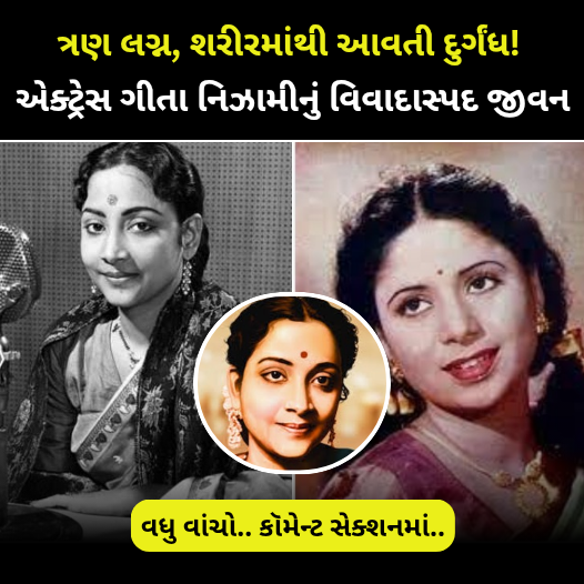 કોર્ટમાં પલટી: જ્યારે તેમને કોર્ટમાં રજૂ કરવામાં આવ્યા, ત્યારે તેમણે આત્મવિશ્વાસ સાથે જૂઠું બોલીને બધાને ચોંકાવી દીધા કે તેમણે અગાઉ ક્યારેય કોઈની સાથે લગ્ન કર્યા જ નથી!છેલ્લો સમય અને ગુમનામીભારત આઝાદ થયા બાદ 1952માં તેઓ પાકિસ્તાન જતા રહ્યા. ત્યાં તેમણે પોતાનું ડાન્સ ગ્રુપ બનાવ્યું અને સ્ટેજ શો કર્યા, પણ જૂની સફળતા પાછી ન મળી. આખરે, 28 એપ્રિલ 2008ના રોજ કરાચીમાં તેમણે ગુમનામીની હાલતમાં અંતિમ શ્વાસ લીધા.ગીતા નિઝામીની આ કહાની સાબિત કરે છે કે ટેલેન્ટ તમને સફળતા અપાવી શકે છે, પણ શિસ્ત અને સ્વચ્છતા વગર તે સફળતા ટકાવી રાખવી અશક્ય છે.શું તમે ગીતા નિઝામીની કોઈ ખાસ ફિલ્મ કે તે સમયની બીજી કોઈ અભિનેત્રી વિશે જાણવા માંગો છો?