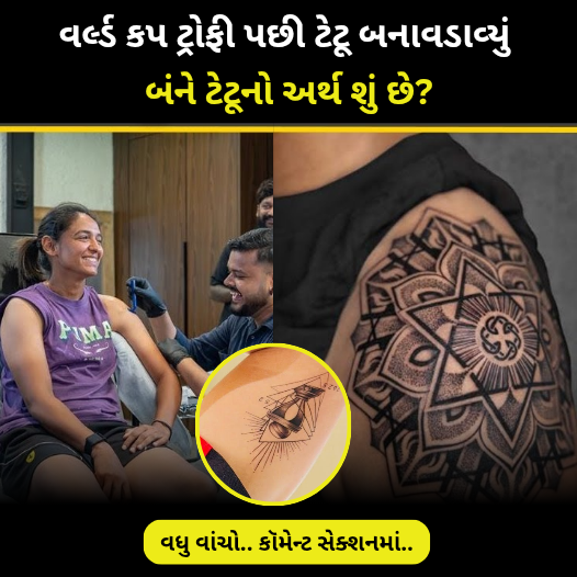 હું પહેલી જ દિવસે તારી રાહ જોઈ રહી હતી, હવે દરરોજ સવારે તને જોઈશ અને આભારી રહીશ.”તે પહેલા હરમનપ્રીતે પોતાના ખભા પર પણ એક ટેટૂ ગૂદાવ્યો હતો, જેનો અર્થ ખૂબ જ ઊંડો છે. આ ટેટૂ એલિયન ટેટૂ સ્ટુડિયો ના વિશાલ મૌર્યાએ બનાવ્યો હતો. તેમાં જ્યોમેટ્રિક મંડલ ડિઝાઇન સાથે સૂર્યકિરણો, બ્રહ્મ યંત્ર અને સેલ્ટિક નોટ નું ડિઝાઇન છે. સેલ્ટિક નોટ એક પરંપરાગત પ્રતિક છે જે અનંત સંબંધનું પ્રતિક દર્શાવે છે — તેની કોઈ શરૂઆત નથી અને કોઈ અંત નથી.અહેવાલો મુજબ, હરમનપ્રીત કૌરના આ ટેટૂમાંનો સેલ્ટિક નોટ તેમના પિતા હરમિંદર સિંહ ભુલ્લર સાથેના અનંત બંધનનું પ્રતિક છે.તો તમને હરમનપ્રીત કૌરનો કયો ટેટૂ વધુ ગમ્યો? અમને કમેન્ટમાં જરૂરથી જણાવો.