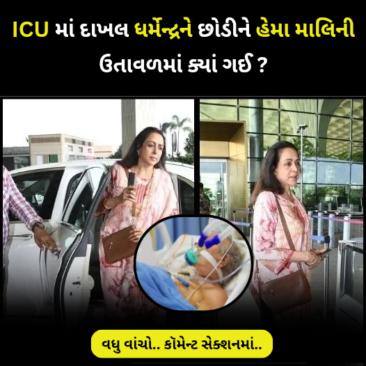 બીમાર ધર્મેન્દ્રને છોડીને હેમા માલિની ક્યાં ઉતાવળમાં ગઈ? જ્યારે અભિનેતાના સ્વાસ્થ્ય વિશે પૂછવામાં આવ્યું ત્યારે પાપારાઝીએ આશ્ચર્યજનક જવાબ આપ્યો. 89 વર્ષીય ધર્મેન્દ્ર શ્વાસ લેવામાં તકલીફથી પીડાતા હતા અને તેમને હોસ્પિટલમાં દાખલ કરવા પડ્યા હતા. અભિનેત્રીએ ધર્મેન્દ્રના સ્વાસ્થ્ય વિશે મહત્વપૂર્ણ રહસ્યો જાહેર કર્યા. ચાહકો બોલિવૂડના હી-મેન વિશે ચિંતિત છે
