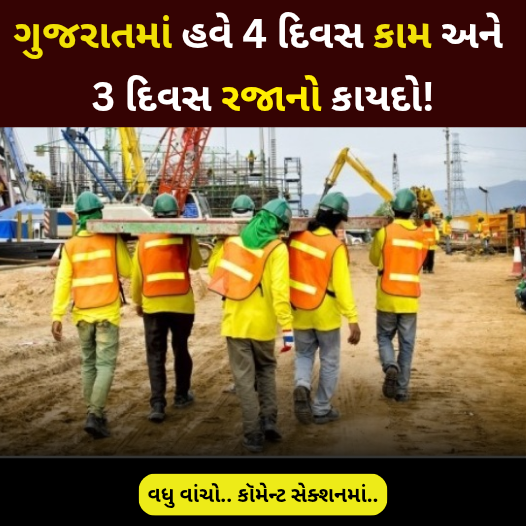 એ પહેલા હું તમને જણાવી દઉં તો એની અંદર એવું છે કેઆઠ દિવસમાં 8 કલાકને બદલે 12 કલાક કામ કરવાની છૂટ છે અને સપ્તાહની અંદર ટોટલ જે કામ કરવાનું છે એ 48 કલાક એટલે એક દિવસમાં 12 કલાકચાર દિવસમાં 48 કલાક હવે તમેછ દિવસ કામ કરતા હો તો 8 કલાક * 6 એટલે 48 કલાક થાય એટલે મૂળ વાત એ છે કે 48 કલાક કામ કરવાનું છે અને એની સામે જો કોઈ કામદાર અઠવાડિયાની અંદર ચાર દિવસમાં 12 કલાક કામ કરે છે તો બાકીના ત્રણ દિવસ એને સહવેતન રજા મળશે એટલે સરકારનો આશય એવો છેસરકારનું કહેવું એમ છે
