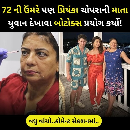 પ્રિયંકાની માતા ૭૨ વર્ષની ઉંમરે પણ યુવાન દેખાવા માંગે છે. પ્રિયંકાની માતાએ પોતાના પર બોટોક્સ અજમાવ્યું. જ્યારે તેણીએ પોતાને બોટોક્સ [મ્યુઝિક] ઇન્જેક્શન આપ્યું ત્યારે ચાહકો આશ્ચર્યચકિત થઈ ગયા. તેણીએ યુવાન દેખાવા માટે પોતાના પર પ્રયોગ કર્યો.અભિનેત્રીની માતાનો બોટોક્સ [સંગીત] વિડિઓ વાયરલ થયો છે. હા, દેશી ગર્લ પ્રિયંકા ચોપરાની માતા, ડૉ. મધુ ચોપરા, આજકાલ એક અલગ જ કારણસર ચર્ચામાં છે. તેમનો એક વિડિઓ સોશિયલ મીડિયા પર ઝડપથી વાયરલ થઈ રહ્યો છે, જેમાં તે ઇન્જેક્શન આપવાને બદલે તેના ચહેરા પર બોટોક્સ લગાવતી જોવા મળે છે.
