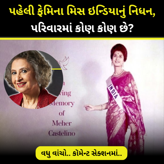 ભારતની પહેલી ફેમિના મિસ ઇન્ડિયા મેહર કાસ્ટેલિનોને લઈને દુઃખદ સમાચાર સામે આવ્યા છે. તેમનું અવસાન થઈ ગયું છે. તેઓ 81 વર્ષના હતા. તેમના નિધનની પુષ્ટિ ફેમિના મિસ ઇન્ડિયા ઓર્ગેનાઇઝેશનના ઇન્સ્ટાગ્રામ પેજ દ્વારા કરવામાં આવી છે. ઓર્ગેનાઇઝેશને તેમને માર્ગદર્શક તરીકે ઓળખાવ્યા છે. તેમણે આવનારી પેઢીની મહિલાઓ માટે મજબૂત પાયો રચ્યો હતો.