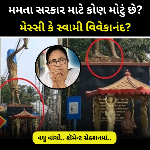 આ પ્રતિમા હતી કોલકાતાથી શિકાગો સુધી ભારતીય દર્શનને વિશ્વ સમક્ષ રજૂ કરનાર આધ્યાત્મિક વેદાંત અને રાજયોગના પ્રવર્તક સ્વામી વિવેકાનંદજીની.તસવીરમાં સ્પષ્ટ રીતે જોઈ શકાય છે કે મેસીની વિશાળ પ્રતિમાની બાજુમાં સ્વામી વિવેકાનંદજીની પ્રતિમા સ્થાપિત છે. જો તમે ધ્યાનથી જુઓ તો એવું લાગે છે કે વિવેકાનંદજીની પ્રતિમા મેસીના પગ નીચે આવી રહી હોય. હવે પ્રશ્ન એ ઊભો થાય છે કે જેમણે કોલકાતાની ધરતી પરથી વિશ્વને ભારતના આધ્યાત્મિક ધર્મ અને દર્શનથી પરિચિત કરાવ્યા અને ગુલામીના સમયમાં ભારતનું નામ રોશન કર્યું, એ જ સ્વામી વિવેકાનંદજીની પ્રતિમાનું અપમાન તેમની પોતાની જન્મભૂમિ અને કર્મભૂમિ પર કેવી રીતે થઈ શકે.