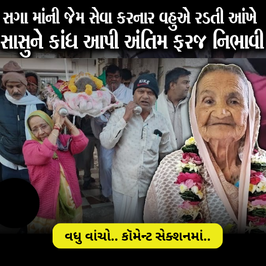 જે જોઈને તમે પણ કહેશો કે જો દરેક ઘરમાં સાસુ વહુનો આવો સંબંધ હોય તો કોઈ પણ ઘર તૂટશે નહીં 95 વર્ષની વયે સાસુ કસ્તૂરબેને અંતિમ શ્વાસ લઈ લીધા ઘરમાં અંતિમ વિદાયની તૈયારીઓ થઈ રહી હતી. તેની વચ્ચે દીકરાની જેમ સાસુની સેવા ચાકરી કરનાર વીણાબેને તેમના પાર્થિવ દેહને કાંધ આપી ભારે હૃદયે સાસુને અંતિમ વિદાય આપી નમસ્કાર આપની સાથે હું મમતા ગઢવી અને માતા દીકરીના પ્રેમ કરતાં પણ ચડ્યા હતા આ સાસુ-વહુના સંબંધની વિગતે વાત કરીએ વાત ગુજરાતી પર બદલાતા સમય સાથે આજે સાસુ વહુના અણબનાવના અનેક કિસ્સાઓ સામે આવતા રહે છે પરંતુ સાસુને પોતાની માતા માને અને સાસુ પણ પુત્રવધુને પોતાની દીકરી માને જી હા રિયલ લાઈફમાં આવા દ્રશ્યો હાલ જોવા મળ્યા છે જે જોઈને સૌ કોઈ ભાવ વિભોર થઈ રહ્યા છે.
