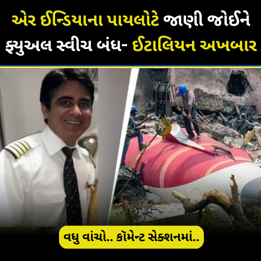 એર ઈન્ડિયા 171 ના પાયલોટે જાણી જોઈને ફફ્યુઅલ સ્વીચ બંધ કરી દીધી”ઈટાલિયન અખબારે જણાવ્યું હતું વર જૂનના રોજ, એર ઈન્ડિયાનું બોઈંગ ૭૮૭-૮ ડ્રીમલાઈનર વિમાન (ફ્લાઈટ ૧૭૧) અમદાવાદ એરપોર્ટ પરથી ટેકઓફ કર્યા પછી તરત જ ક્રેશ થયું હતું, જેમાં ૨૬૦ લોકો માર્યા ગયા હતા.