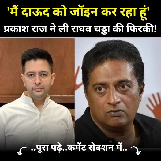 राघव चड्ढा पर प्रकाश राज ने कसा तंज:BJP में शामिल होने को लेकर बोले- मैं दाऊद इब्राहिम से जुड़ रहा हूंआम आदमी पार्टी छोड़कर BJP में शामिल होने वाले सांसद राघव चड्ढा पर एक्टर प्रकाश राज ने तंज कसा।प्रकाश राज ने ट्विटर पर अपनी पोस्ट में लिखा, ‘मैं पुलिस फोर्स छोड़ रहा हूं क्योंकि वे अपराध से लड़ने के अपने वैल्यूज से भटक गए हैं। इसलिए मैं दाऊद इब्राहिम से जुड़ रहा हूं – राघव चड्डी।’ इसके साथ उन्होंने हंसने वाला इमोजी और #justasking भी लिखा।