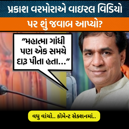 કોઈપણ રાજનીતિમાં હોય કે પછી જાહેર જીવનમાં વ્યક્તિ હોય એનાથી ભૂલો થાય છે પણ એ ભૂલોથી એને સુધરવું જોઈએ હું એવું કહેવા માંગતો તો હતો એમને ગાંધી બાપુનું ઉદાહરણપણ આપ્યું કે જેતે સમય મહાત્મા ગાંધી પણ દારૂ પીતા હતા અને પછી એમને પણ બહુ જ બધો બદલાવ લાવ્યો સરદાર ગાંધી અને એ લોકોએ જેવી રાજનીતિ અને જેવા દેશની કલ્પના કરી હતી આપણે શું એવા દેશ તરીકે આગળ વધી રહ્યા છીએ કે કેમ એ સવાલ પણ એમને વીડિયોમાં કર્યો છે તો પ્રકાશ વરમોરાએ લોકોની માફી પણ માંગી અને એવું કહ્યું કે જો તમને આ મારી વાતથી કઈ ખોટું લાગ્યું હોય તો મને માફ કરજો પણ મારી ભાવના ખોટી ન હતી તો એ વિડીયો બનાવીને એમને જનતાને અને જેટલા પણ લોકો એમની ની એક ક્લિપ ચલાવી છે એમને જે સંદેશો આપ્યો છે તે સાંભળો. સૌ મારા આત્મીયબંધુ ભગીનીઓને મારા અંતઃકરણથી પ્રણામ નમસ્કાર આજથીદસ દિવસ પહેલા ધાંગતરામાં અલૌકિક પ્રાણ પ્રતિષ્ઠા મહોત્સવ હતો અને એ કાર્યક્રમમાં મારે જવાનું થયું હતું
