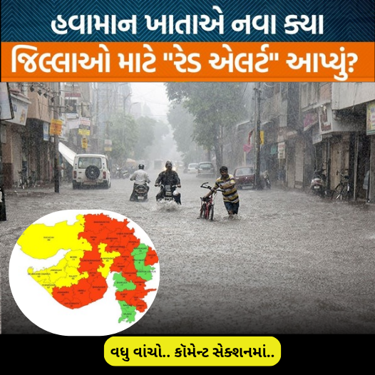 ગુજરાત રીજનમાં આજે જે જિલ્લાઓમાં ભારે થી અતિ ભારે વરસાદ માટે રેડ વોર્નિંગ આપવામાં આવી છે તે છે બનાસકાંઠા અને પાટણ. મહેસાણા અને સાબરકાંઠા જિલ્લામાં ભારે વરસાદની ચેતવણી છે.સૌરાષ્ટ્રમાં કચ્છ જિલ્લામાં અતિ અતિ ભારે વરસાદ માટે રેડ વોર્નિંગ આપવામાં આવ્યું છે.
