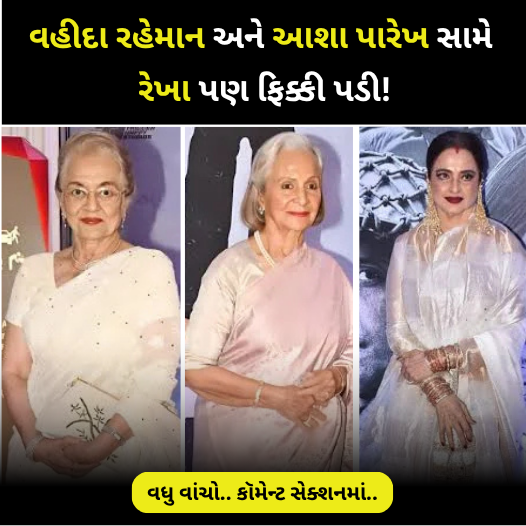 આપણે વાત કરી રહ્યા છીએ ભૂતકાળની દિગ્ગજ અભિનેત્રીઓ, વહીદા રહેમાન, આશા પારેખ અને રેખા વિશે. હવે, આ સુંદરીઓના ચહેરા પર સમયનો પ્રકોપ દેખાઈ શકે છે. પરંતુ વધતી ઉંમર સાથે પણ, ન તો તેમની સુંદરતા ઓછી થઈ છે અને ન તો તેમના દેખાવમાં કોઈ ફેરફાર થયો છે. હા, એ અલગ વાત છે કે આ વખતે, આશા પારેખ અને વહીદા રહેમાનની સાદી સુંદરતા સામે, ઉમરા ઓ જાન રેખાનો મોહ થોડો ઓછો થઈ ગયો હોય તેવું લાગે છે. સૌ પ્રથમ, વાત કરીએ વહીદા રહેમાન વિશે, જે સાદગી અને ભવ્યતાની એક ઉદાહરણ છે. 87 વર્ષની ઉંમરે પણ, વહીદા રહેમાન ઘણીવાર બોલિવૂડના કાર્યક્રમોમાં હાજરી આપતા જોવા મળે છે.