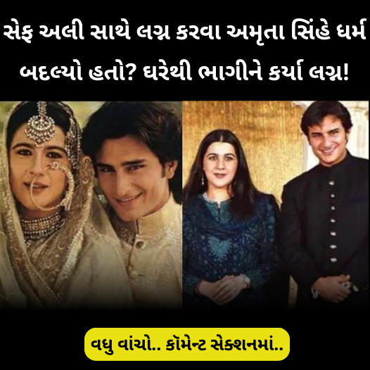 ઘરેથી ભાગીને ચોરીછૂપી રીતે નિકાહ કર્યો હતો. ધર્મ બદલી અમૃતા બની અજીજા. સૈફના પ્રેમમાં અમૃતાએ પોતાની માતા સામે બગાવત કરી, તો સૈફે પોતાની મા શર્મિલાને અંધારામાં રાખી. મૌલવી દ્વારા નિકાહ વાંચવામાં આવ્યો અને એક સીખ પંડિતે અમૃતાને નવું નામ આપ્યું. લગ્નના દિવસે અમૃતા પોતાની માતાના દાગીના પહેરી, પોતાથી 12 વર્ષ નાના સૈફની દુલ્હન બની હતી. સારા ખાનના અમ્મી-અબ્બુના આ સીક્રેટ નિકાહનો ચોંકાવનારો ખુલાસો નજીકના લોકો દ્વારા કરવામાં આવ્યો છે.સૈફ અલી ખાન આજે બીજી પત્ની સાથે ખુશحال લગ્નજીવન જીવી રહ્યા છે,