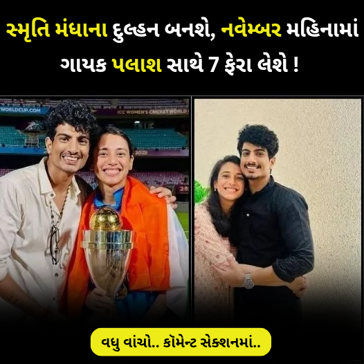 વર્લ્ડ ચેમ્પિયન ગર્લફ્રેન્ડે ખુશખબર જાહેર કરી. લગ્ન પહેલા મોટી ભેટ આપી. પ્રખ્યાત ગાયિકા ખુશીથી ઉછળી પડી અને ટૂંક સમયમાં ચેમ્પિયન થનારી તેની પત્ની પર ખુલ્લેઆમ પ્રેમ વરસાવ્યો. વાયરલ તસવીરોએ ચાહકોના દિલ જીતી લીધા. તો અહીં અમે ટીમ ઈન્ડિયાની ઉપ-કેપ્ટન સ્મૃતિ મંધાના વિશે વાત કરી રહ્યા છીએ, જેમણે મહિલા વર્લ્ડ કપ 2025 ટ્રોફી જીતીને ઇતિહાસ રચ્યો. તમે બધા જાણો છો કે ભારતે 2 નવેમ્બરના રોજ દક્ષિણ આફ્રિકા સામે મહિલા વર્લ્ડ કપ 2025 ટ્રોફી જીતીને ઇતિહાસ રચ્યો હતો.