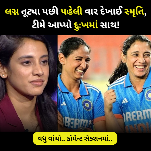 લગ્ન તૂટ્યા પછી પહેલી વાર જાહેરમાં દેખાઈ સ્મૃતિ મંધાના.ભારતની મહિલા ક્રિકેટ ટીમની વાઇસ કેપ્ટન અને સ્ટાર ખેલાડી સ્મૃતિ મંધાના હાલમાં એક મુશ્કેલ જીવનપ્રસંગમાંથી પસાર થઈ રહી છે. તેના જીવનમાં આવેલો આ મોટો ઝટકો તેને આજીવન દુઃખ અને ટ્રોમા આપીને ગયો છે. જેમ દિવસે તે દુલ્હન બનવાની હતી, એ જ દિવસે તેના પ્રેમ અને લગ્ન પરનો વિશ્વાસ તૂટી પડ્યો.છેલ્લાં ઘણા દિવસોથી સ્મૃતિ મનમાં પહાડ જેવી પીડા સાથે લડી રહી છે.