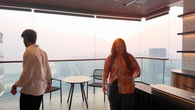 બાલ્કની શહેરના અદભુત દૃશ્યો આપે છેલિવિંગ રૂમ એક પહોળી બાલ્કનીમાં ખુલે છે જ્યાંથી મુંબઈના આકાશરેખાના વિશાળ દૃશ્યો દેખાય છે. જોકે, પ્રદૂષણ દ્રશ્યને થોડું બગાડે છે, અને સોનાક્ષીએ ટિપ્પણી કરી, “એવું દૃશ્ય ધરાવતી બાલ્કની.” બાલ્કનીને તેજસ્વી પીળા સોફા અને દંપતીના રંગબેરંગી ચિત્રોથી શણગારવામાં આવી છે, જે મહેમાનોને આરામ કરવા અથવા મનોરંજન માટે એક ખુશખુશાલ અને આમંત્રિત સ્થળ બનાવે છે.