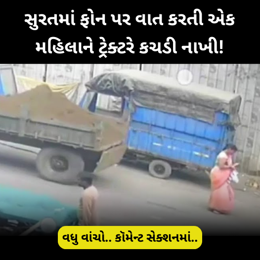 સુરતનો વીડિયો: ફોન પર વાત કરતી મહિલા પર ટ્રેક્ટરે કચડી નાખ્યોસુરત શહેરના અલથાણ-ભટાર વિસ્તારમાં એક બાંધકામ સ્થળ પર એક હૃદયદ્રાવક અકસ્માત થયો હોવાનું સીસીટીવી ફૂટેજમાં જોવા મળ્યું છે. ફોન પર વાત કરી રહેલી એક મહિલાને પલટી રહેલા ટ્રેક્ટરે ટક્કર મારી હતી. તે ટ્રેક્ટરના બે ટાયર વચ્ચે ટ્રોલી નીચે ફસાઈ ગઈ હતી, પરંતુ તે હિંમતભેર ભાગી જવામાં સફળ રહી હતી. ગંભીર ઈજાઓ થવા છતાં, તેણીએ પોતાનો જીવ બચાવ્યો હતો
