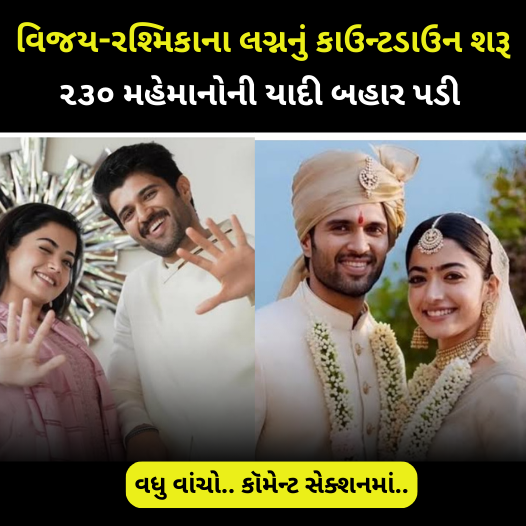 વિજય દેવરકોંડા રશ્મિકા મંડન્ના સાથે લગ્ન કરવા જઈ રહ્યા છે. આ દંપતી ઉદયપુરના શાહી મહેલમાં લગ્ન કરીને નવું જીવન શરૂ કરવા જઈ રહ્યું છે. દેશભરના ખાસ મહેમાનો રશ્મિકા અને વિજયના શુભ લગ્નના સાક્ષી બનશે. 230 મહેમાનોની સંપૂર્ણ યાદી જાહેર કરવામાં આવી છે. લોકો આ પ્રેમી યુગલને દુલ્હા અને દુલ્હન તરીકે જોવાની આતુરતાથી રાહ જોઈ રહ્યા છે.
