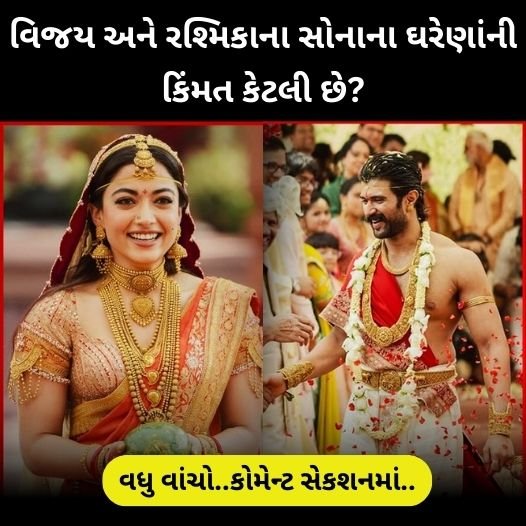 વિજયના ઘરેણાંમાં હાથી અને વાઘની ડિઝાઇન હતી. રશ્મિકાના ઘરેણાં તેને દેવી જેવી આભા આપવા માટે ડિઝાઇન કરવામાં આવ્યા હતા, જે તેની સોનાની દુલ્હનની સાડીને પૂરક બનાવે છે. અહેવાલો સૂચવે છે કે આ સોનાના ઘરેણાંના સેટની કુલ કિંમત ₹1 કરોડથી ₹7 કરોડની વચ્ચે હોવાનો અંદાજ છે. તો, આ માહિતી વિશે તમારો શું વિચાર છે?કૃપા કરીને ટિપ્પણીઓમાં તમારા અભિપ્રાય જણાવો. આવી વધુ વાર્તાઓ સાથે અપડેટ રહેવા માટે અમારી ચેનલને સબ્સ્ક્રાઇબ કરો, અને જો તમને વિડિઓ ગમ્યો હોય તો તેને લાઈક અને શેર કરવાનું ભૂલશો નહીં.
